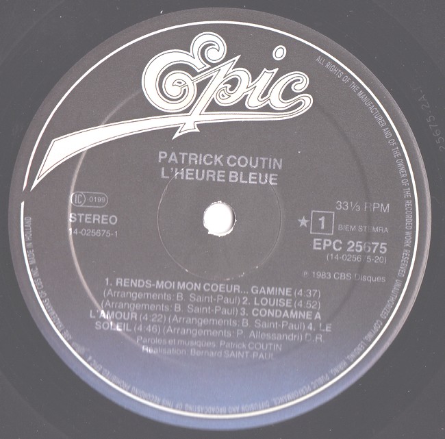 Publié dansPATRICK COUTIN / L’HEURE BLEUE – Epic – EPC 25675 – 1983 – Original