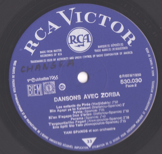 YANI SPANOS et son Orchestre – DANSONS avec ZORBA – RCA VICTOR 530.030 M –