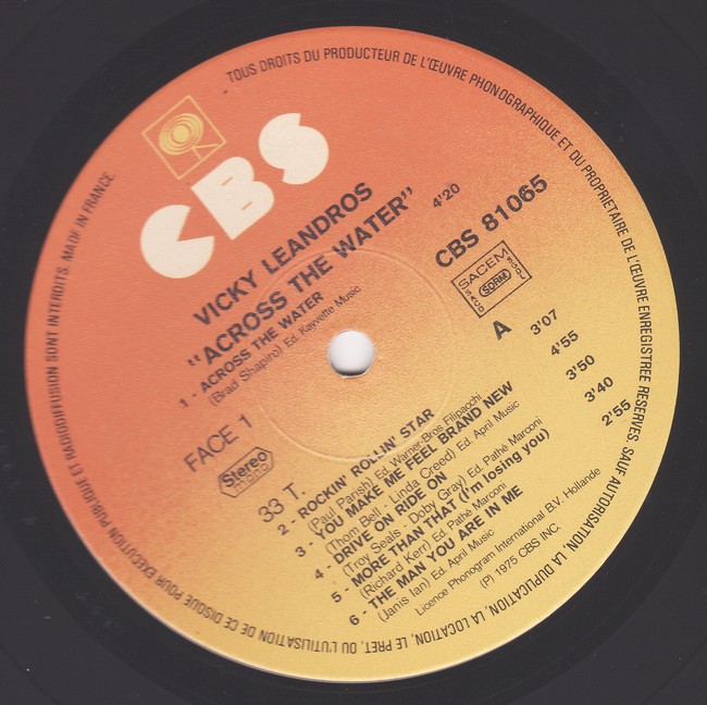 VICKY LEANDROS – ACROS THE WATER – ENREGISTRE A NASHVILLE USA – CBS 91065 – Y -1975 – original (3)