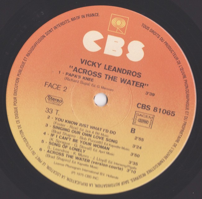 Image précédente Image suivante VICKY LEANDROS – ACROS THE WATER – ENREGISTRE A NASHVILLE USA – CBS 91065 – Y -1975 – original (4)